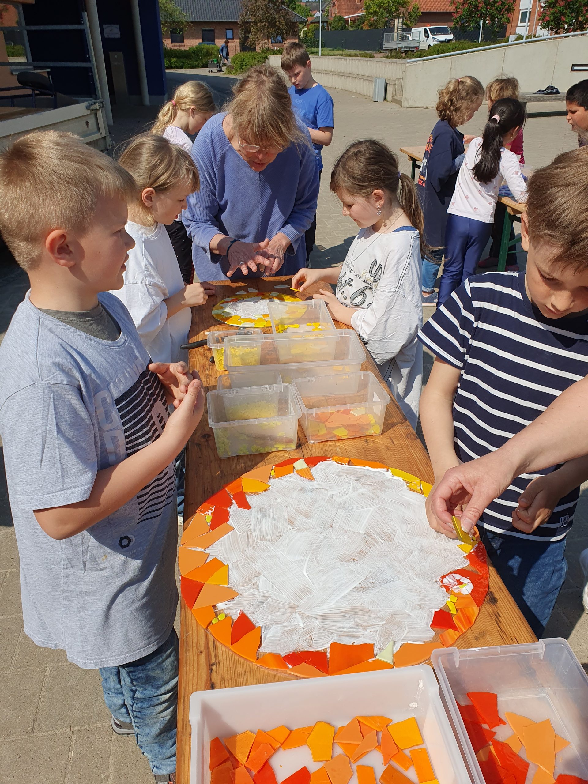Klassenweise durften wir mit bunten Glasscherben Kreise in den verschiedensten Farbtönen gestalten. Das war eine ganz schön knifflige Arbeit. Trotzdem hat es viel Spaß gemacht und die Ergebnisse am Schluss sahen auch ungebrannt schon ziemlich schön aus.